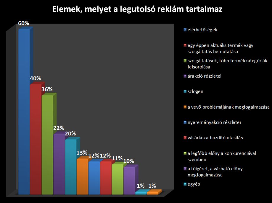 A válaszadók zömének utolsó reklámja termékek, szolgáltatások bemutatásáról szól, a jó hír pedig az, hogy több mint felénél szerepelt elérhetőség (a 2012-es kutatásban ez csak 20% volt), a szlogen viszont csupán 20%-nál jelenik meg.